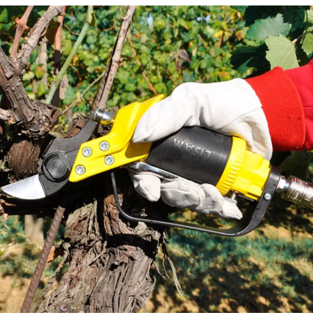 Forbice pneumatica professionale Lisam SLY DT con lame a doppio taglio per potature precise su rami fino a 30 mm di diametro. Prestazioni elevate con aria compressa.